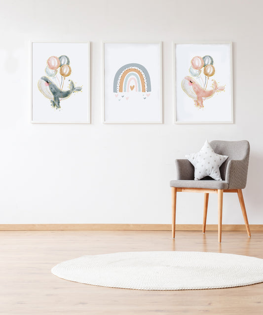 Set 3 Láminas infantiles formado por Lámina ballena gris con globos: Lámina ballena rosa con globos y Lámina arcoiris gris