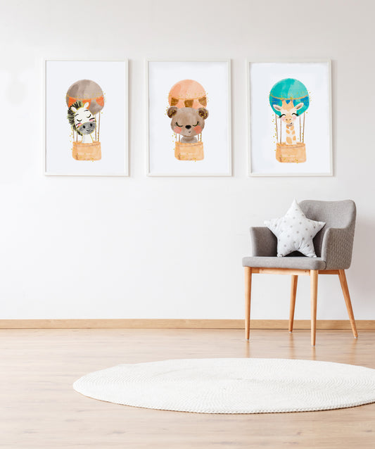 Set 3 Láminas infantiles formado por Lámina cebra en globo: Lámina oso en globo y Lámina jiraba en globo