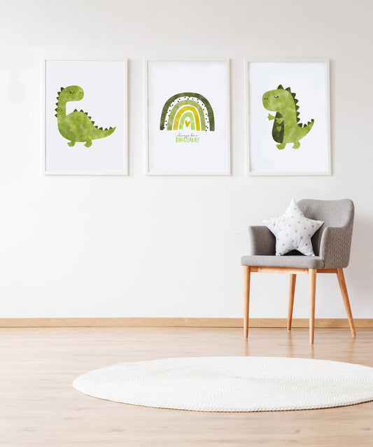Set 3 cuadros infantiles formado por cuadro ilustracion dinosaurio verde: cuadro dinosaurio verde y cuadro arcoiris verde