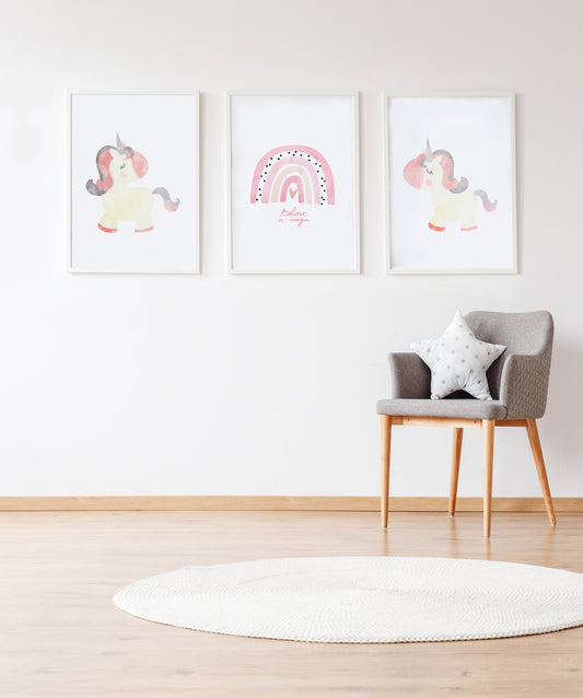 Set 3 cuadros infantiles formado por cuadro ilustracion uniconio: cuadro arcoiris rosa y cuado unicornio blanco y rosa