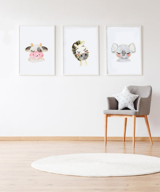 Set 3 cuadros infantiles formado por cuadro vaca: cuadro cebra y cuadro koala