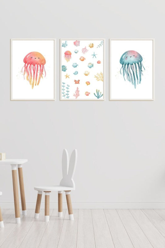 Set 3 Cuadros infantiles formado por Cuadro medusa rosa: estampado océano y medusa azul