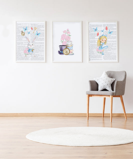 Set 3 cuadros infantiles formado por cuadro conejo fondo cuento: cuadro flores y objetos Alicia y cuadro Alicia fondo cuento