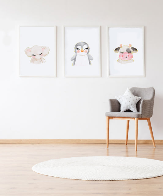 Set 3 cuadros infantiles formado por cuadro elefante: cuadro pingüino y cuadro vaca