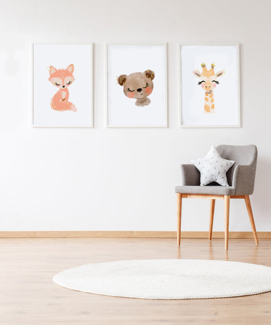 Set 3 cuadros infantiles formado por cuadro zorro: cuadro oso y cuadro jirafa