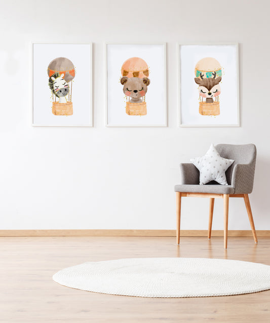 Set 3 Láminas infantiles formado por Lámina cebre en globo: Lámina oso en globo y Lámina ciervo en globo