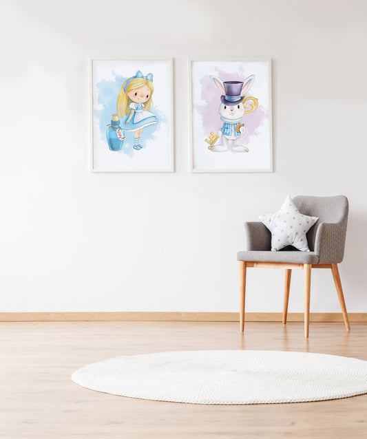 Set 2 cuadros infantiles formado por cuadro Alicia con pocima azul y cuadro conejo con reloj