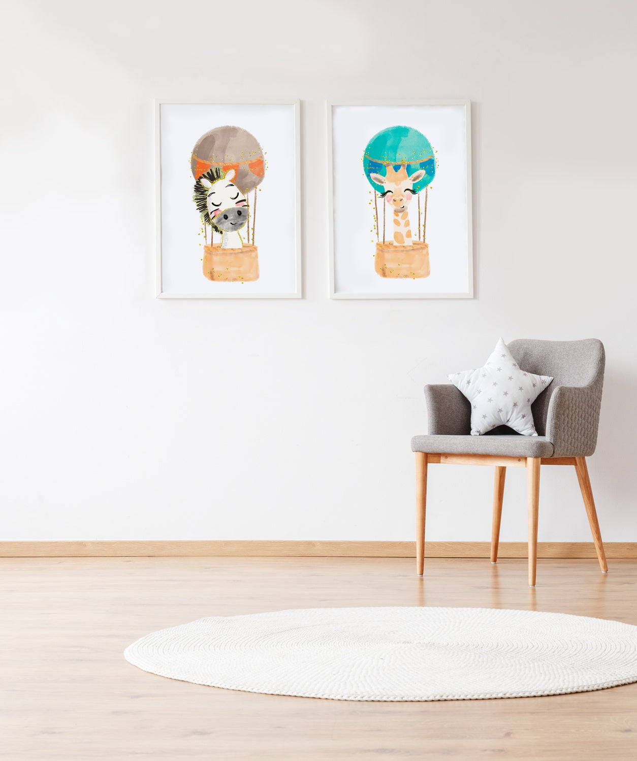 Set 2 cuadros infantiles formado por cuadro cebra en globo y cuadro jirafa en globo