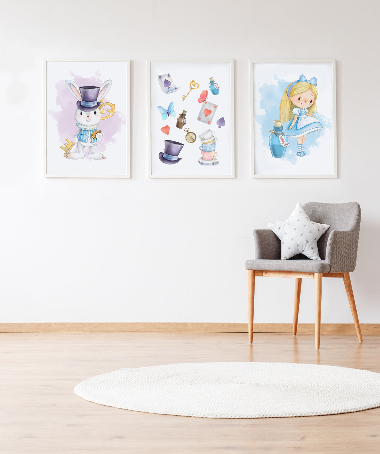 Set 3 cuadros infantiles formado por cuadro conejo llave: cuadro objetos Alicia y cuadro Alicia con pocima azul