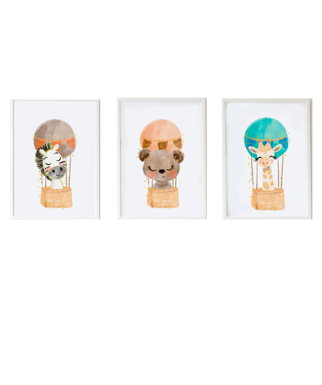 Set 3 Láminas infantiles formado por Lámina cebra en globo: Lámina oso en globo y Lámina jiraba en globo