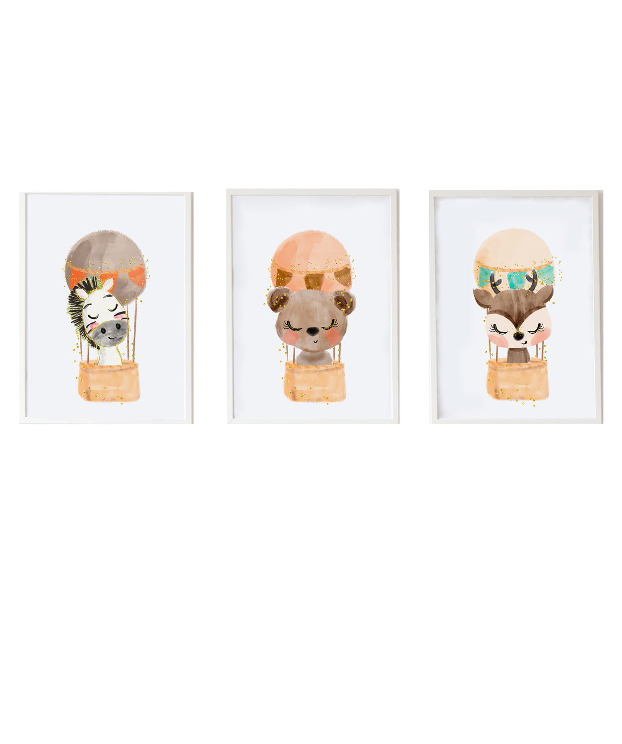 Set 3 Láminas infantiles formado por Lámina cebre en globo: Lámina oso en globo y Lámina ciervo en globo