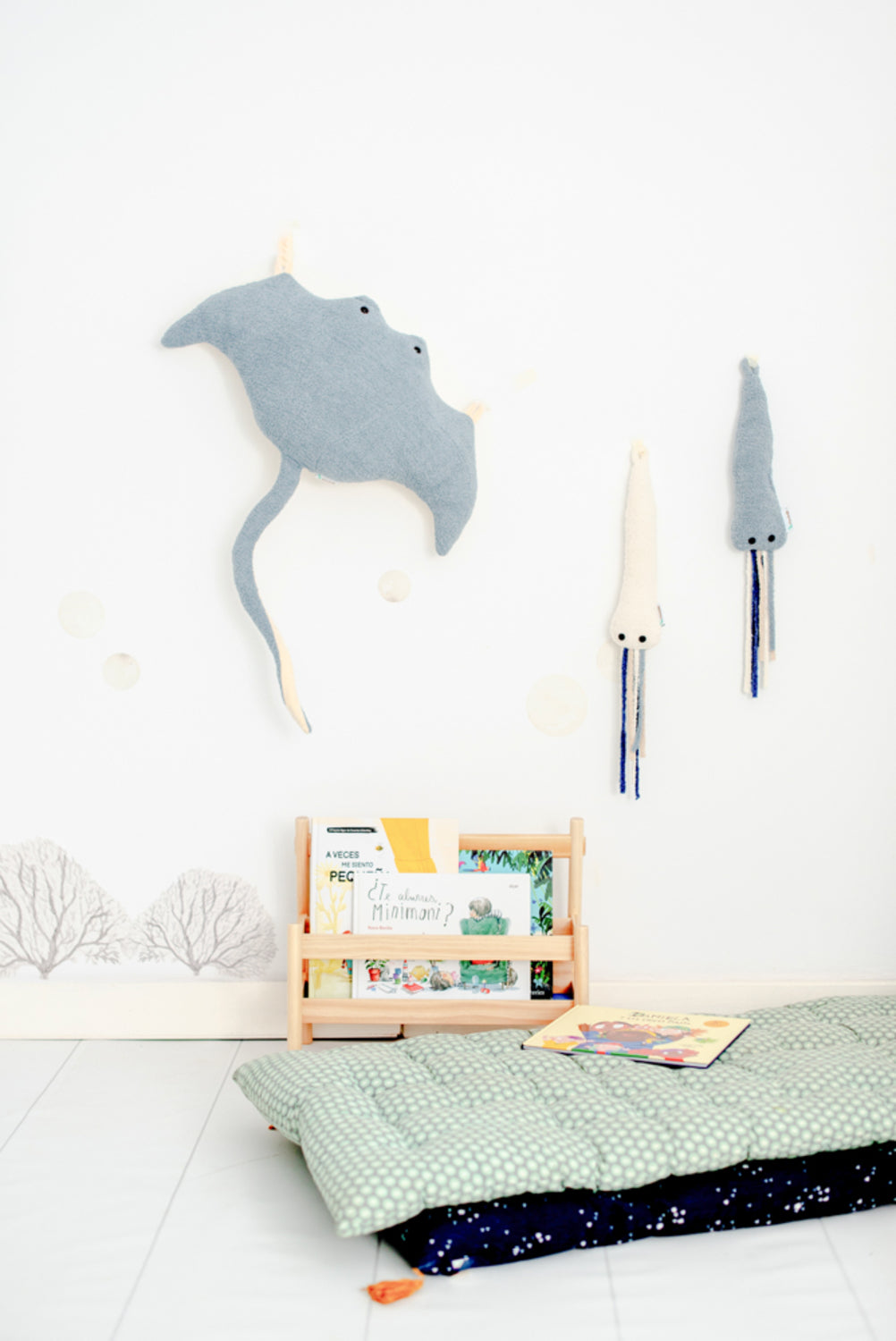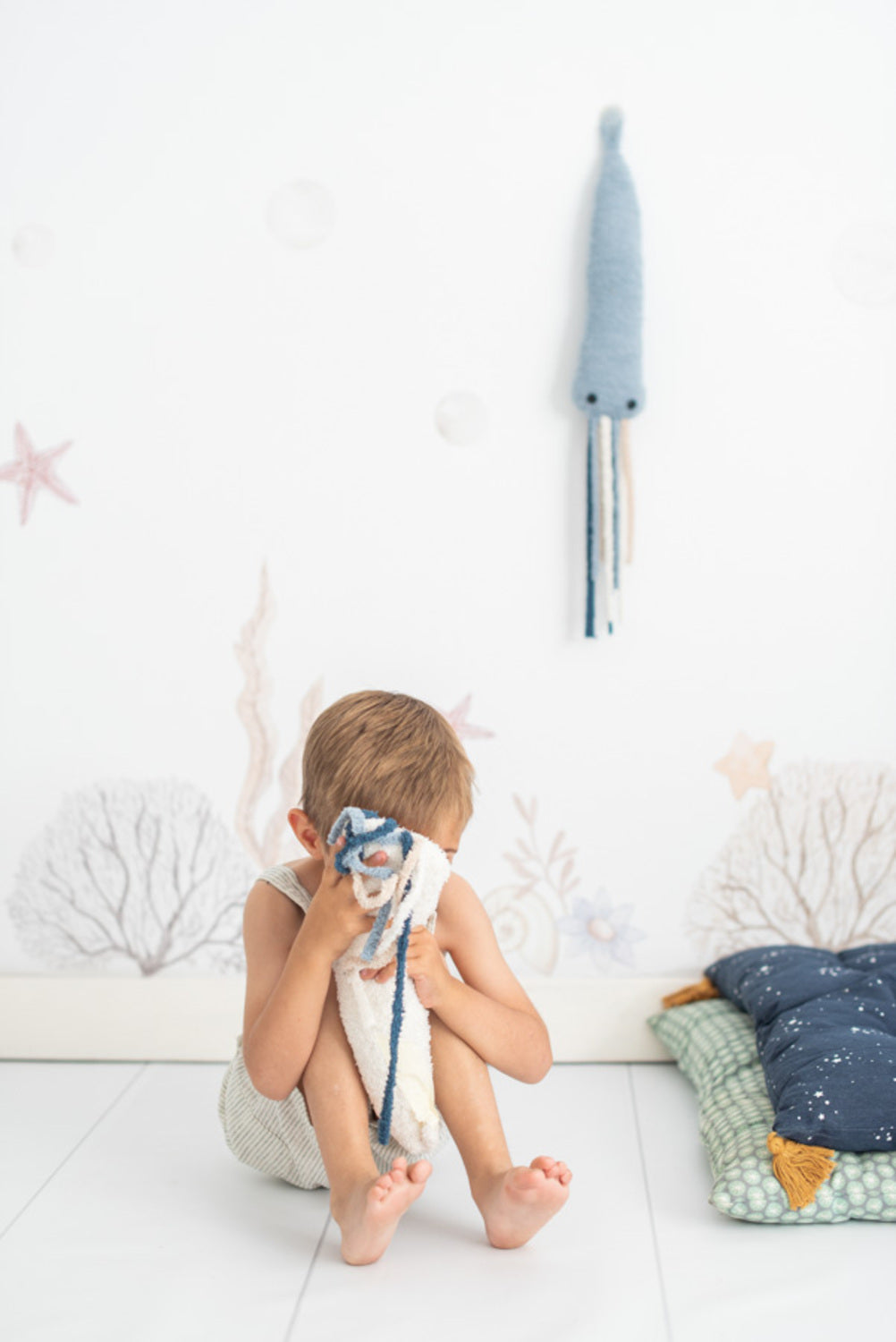 Set 3 peluches infantiles de pared formado por mantarraya azul claro: mini pulpo azul y mini pulpo blanco